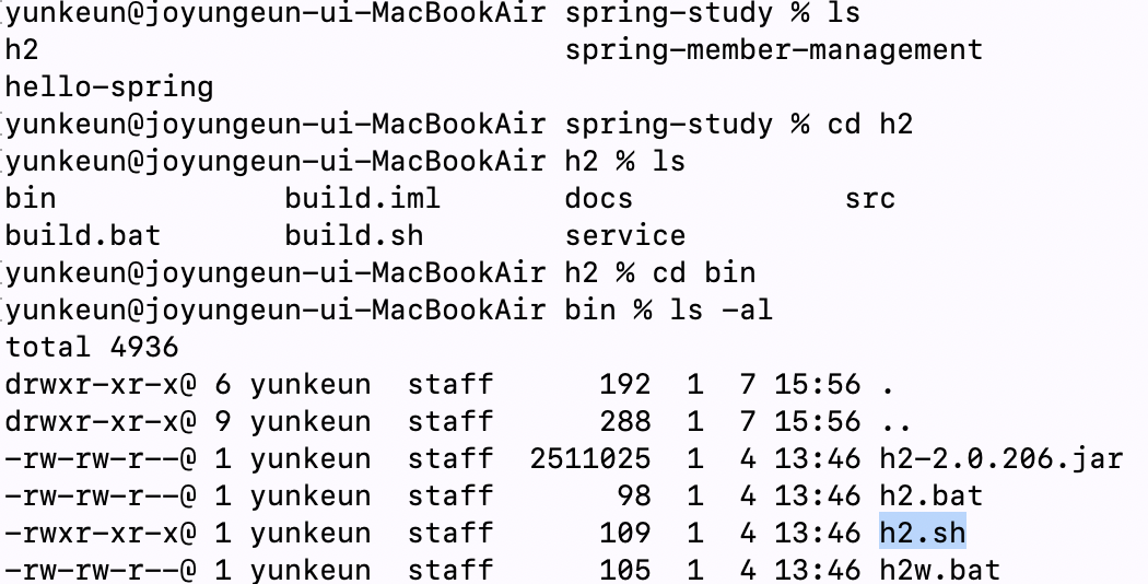 압축 해제한 경로에서 터미널을 열어본다. h2라는 폴더가 생겼다면 그 내부에 bin 폴더로 들어가보자.