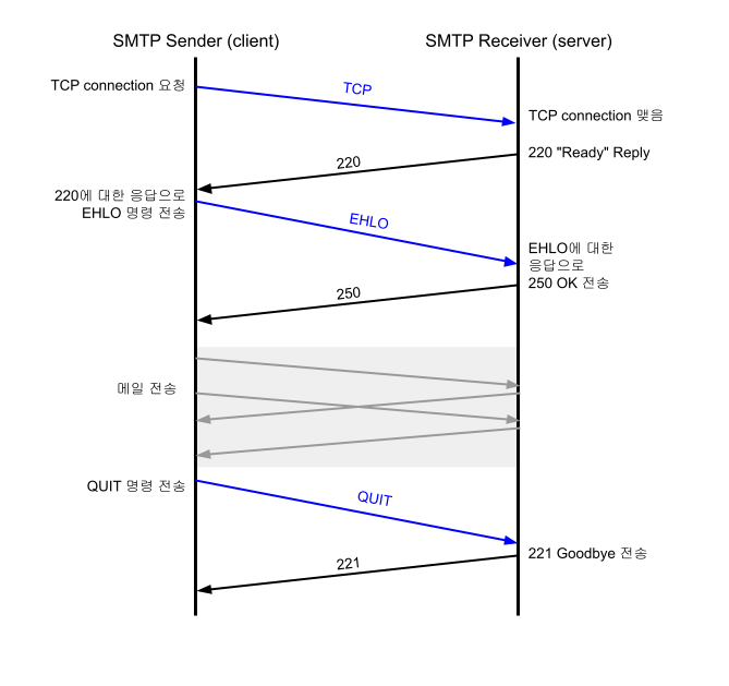 메일 주소에서 username@gmail.com는 SMTP 클라이언트가 될 것이고 gmail.com 주소는 메일을 송수신하는 SMTP 서버가 될 것이다. (gmail의 SMTP 서버 주소는 smtp.gmail.com)