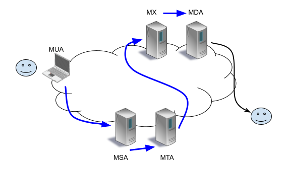 - 송신자는 MUA(Mail User Agent - 메일 클라이언트 프로그램)를 이용해 메일을 만들어 보낸다.